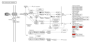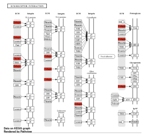 Figure 7. ECM-receptor interaction KEGG Pathway. Integrin proteins and proteoglycan were involved in the ECM-Receptor interaction. Collagen plays a large role in this pathway due to its repetition as shown in red, along with one other gene, Reelin.